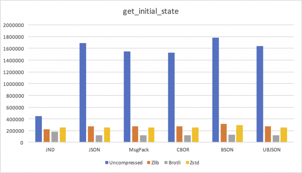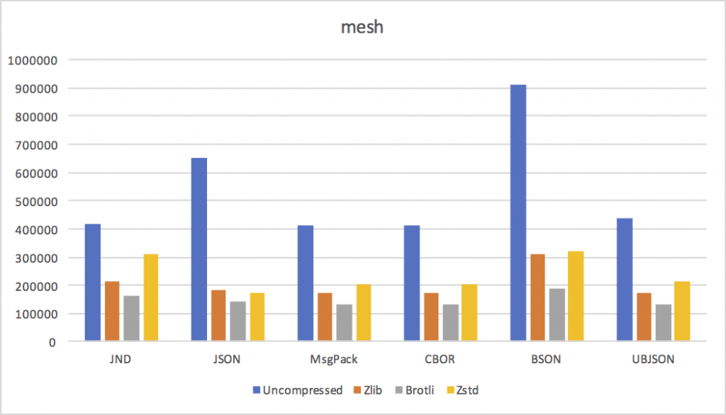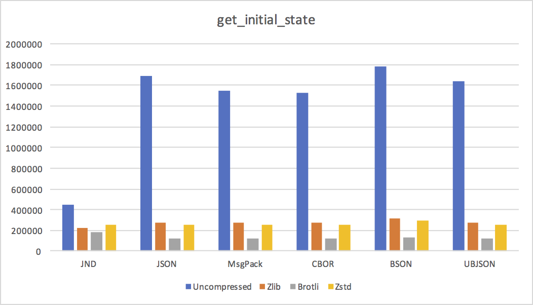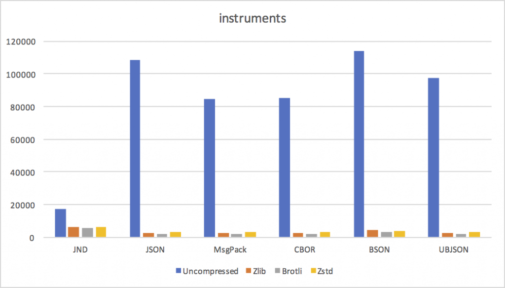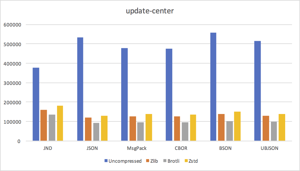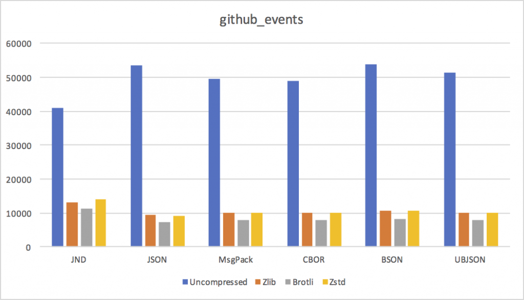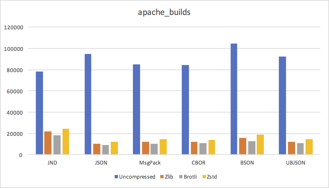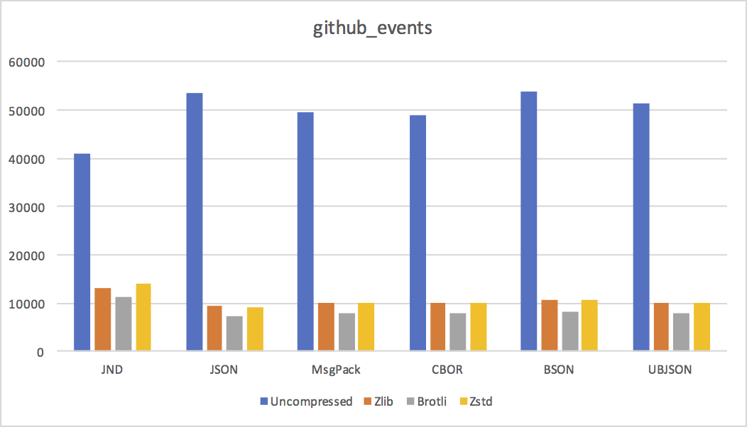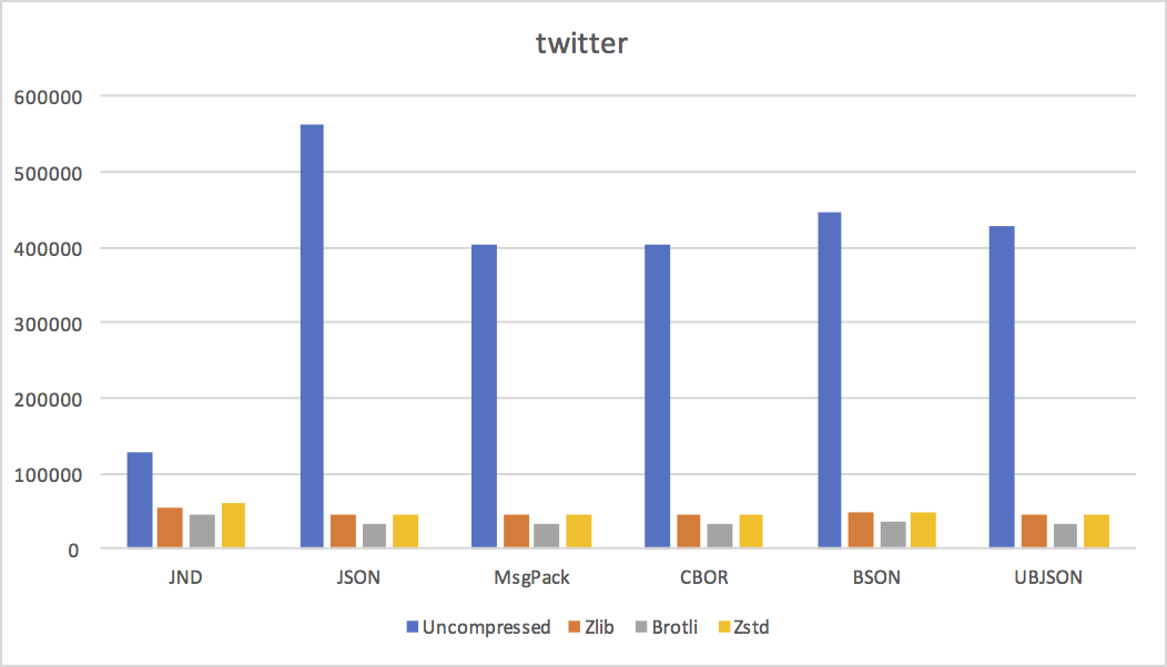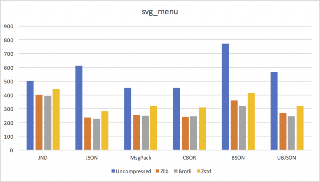 JND's disadvantage is clear in the above graphs: while it's smaller uncompressed, it does not compress as well as JSON or MsgPack. (Except in cases where its uncompressed size is dramatically smaller because of huge amounts of string or object shape reuse.)