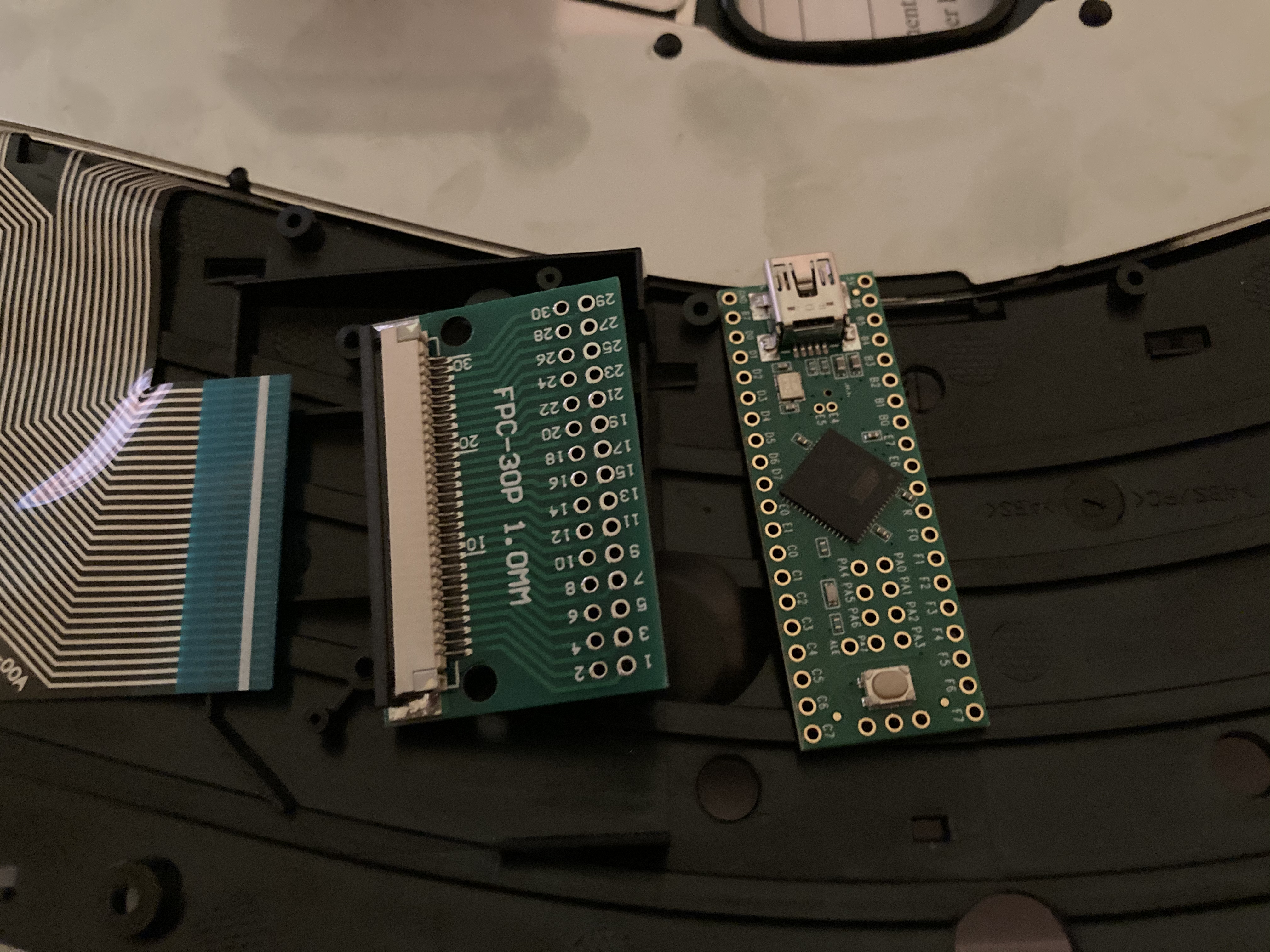 I thought, all I really need is the ribbon cable connector, so I ordered a 30 pin, 1.0 mm pitch ribbon breakout and the pricier (but tons of pins!) Teensy 2.0++. Looking back, it’s cute that I was trying to save $10 on the microcontroller… You just have to get used to spending money on whatever saves you time.