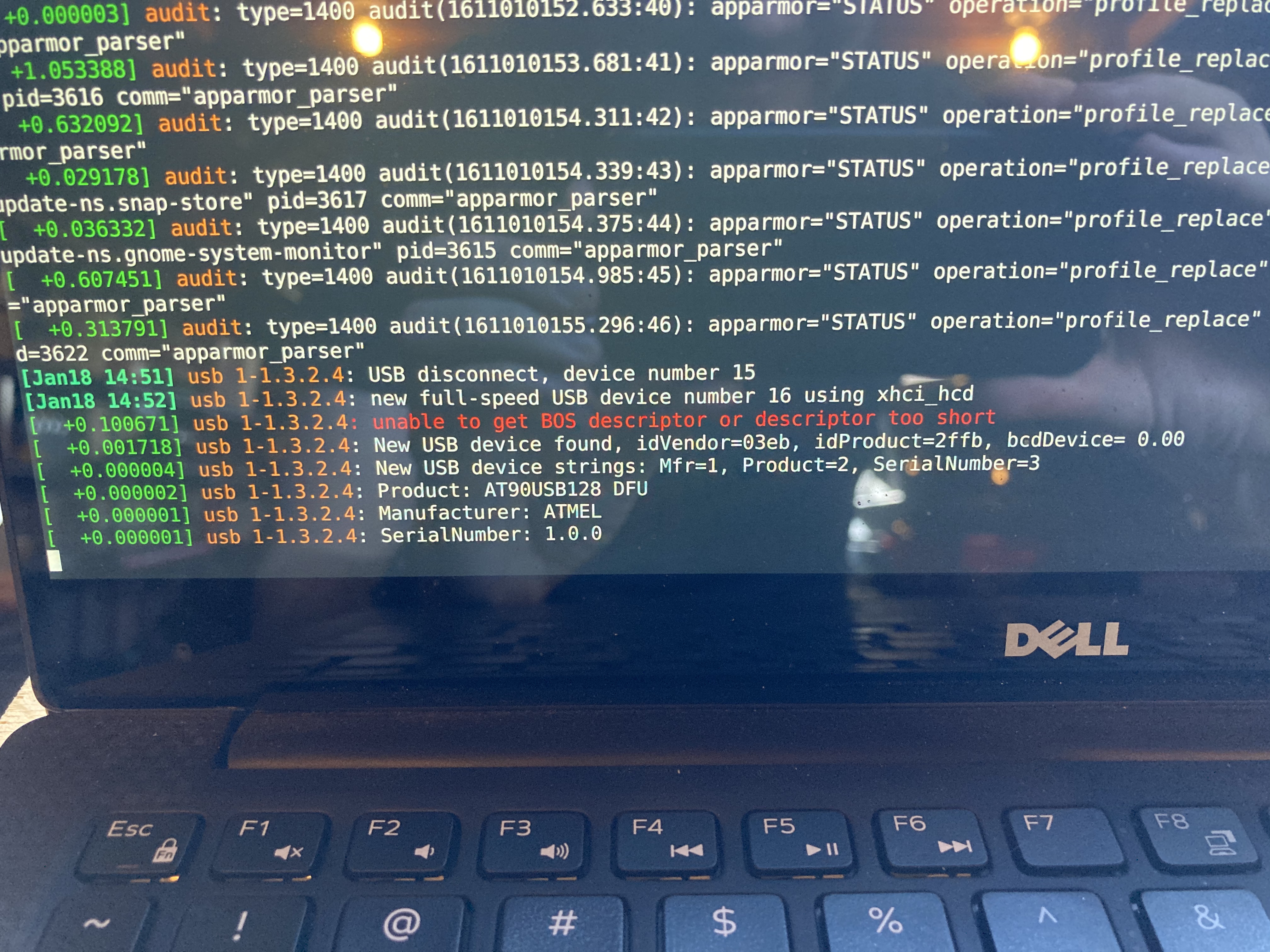 Now that everything seemed electrically correct, it was time to plug it in. Success! The factory-supplied DFU bootloader device showed up.