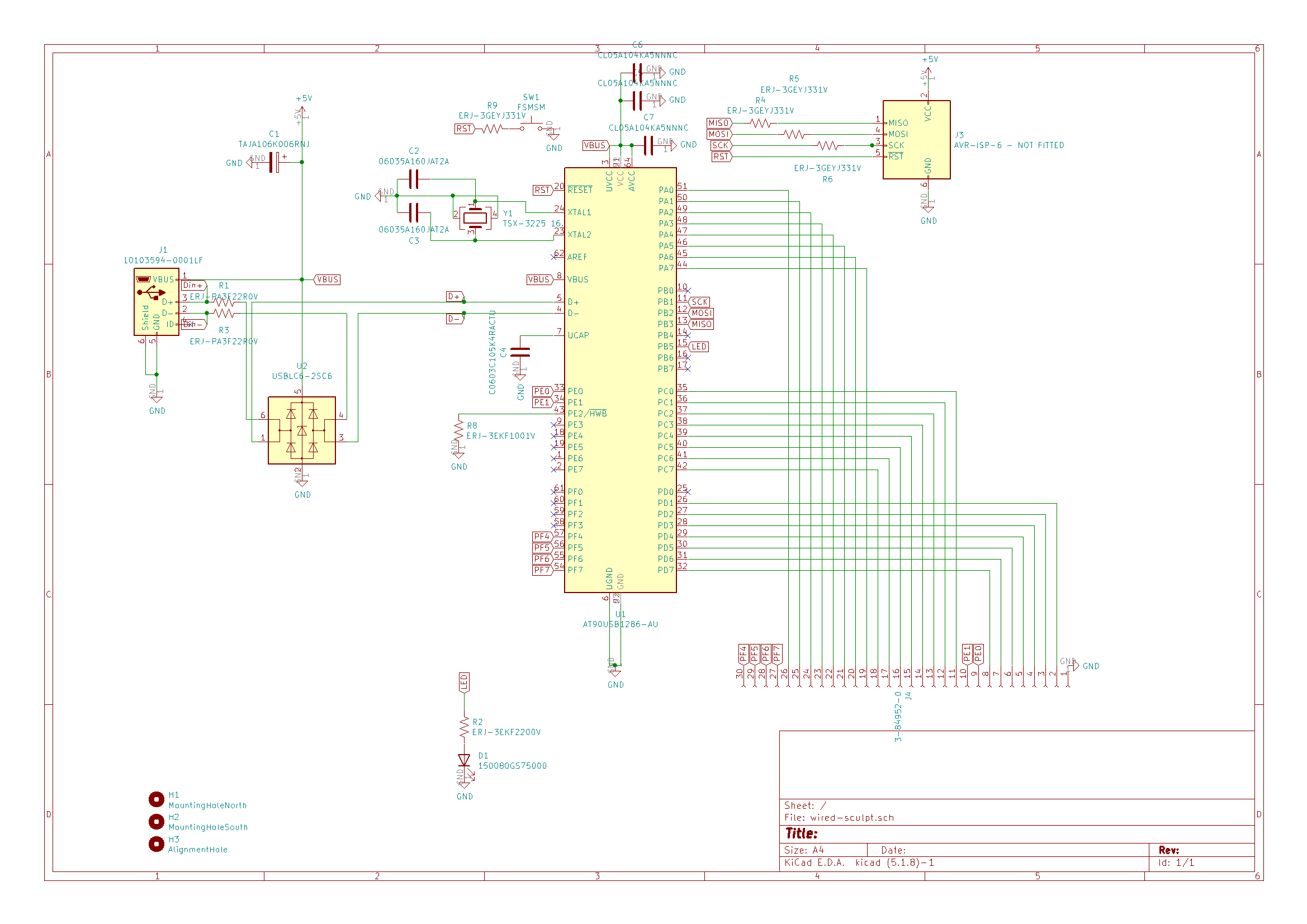 I knew I wanted the main processor to be the AT90USB1286 controller, and fortunately KiCad already had a symbol for it. Atmel has a comprehensive and accessible data sheet, which showed me I needed some 22 Ω resistors on the USB data lines, which of the ISP programmer lines needed resistors (and appropriate values), and that I needed to either pull HWB low, or provide a physical switch that pulls it low, in order to allow rebooting the device into USB firmware update mode.